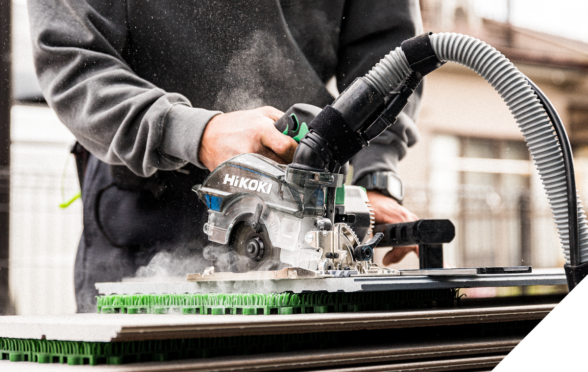 HiKOKIの電動工具の魅力は、パワーと仕上げの美しさ。コードレス丸のこ刃にはスーパーチップソー 黒鯱(クロシャチ)を使用しており、「コバ欠けひとつなく、びっくりしますね。紙みたいにスパっと切れちゃいます。電動工具自体にパワーがあって、チップソーがそれを押し上げる。両製品のバランスがとてもいい」と語る。
